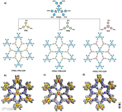 图1. (a) FPDC-TPA-COF、FPDC-TPB-COF和FPDC-TPT-COF的合成示意图;(b) FPDC-TPA-COF、(c) FPDC-TPB-COF和(d) FPDC-TPT-COF的结构。为清楚起见,省略了氢原子。