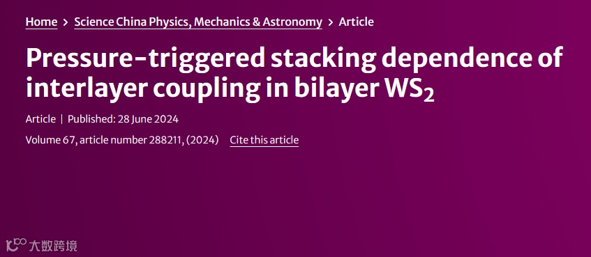 《中国科学:物理学 力学 天文学》英文版(SCIENCE CHINA Physics, Mechanics & Astronomy, SCPMA)近日发表了电子科技大学/中南大学的研究成果,文章题为“Pressure-triggered stacking dependence of interlayer coupling in bilayer WS2”,于2024年第67卷第8期刊出。电子科技大学张泽娟、焦成寅、裴胜海为共同第一作者,王曾晖、夏娟为通讯作者;论文作者还包括了中南大学的周喻等。电子科技大学基础与前沿研究院为第一完成单位。该研究得到了国家杰出青年科学基金、国家自然科学基金原创探索计划等项目的支持。