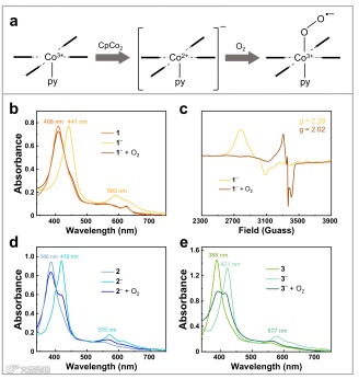 图 2. (a)示意图展示了CoII咔咯的生成以及它们与O2的氧化。(b) 1, 1–和1–与O2结合后的吸收光谱。(c)在四氢呋喃中100 K下1– 和 1–与O2结合后的EPR谱图。(d) 2, 2–和2–与O2氧化后的吸收光谱 (e) 3, 3–和3–与O2结合后的吸收光谱。