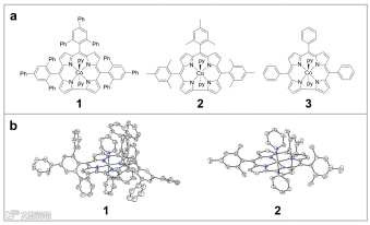 合成并表征了具有不同位阻效应的钴咔咯配合物分子1-3。通过单晶可知Co具有六配位的八面体几何结构,且键价和电荷平衡计算表明Co为+3价。2的X射线结构与1相似,但其meso-取代基团为2,4,6-三甲基-苯基(图1b)。2中的Co离子也是+3价。