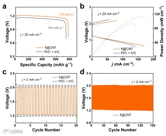 图 5. (a)使用1和Pt/C-Ir/C组装的电池比容量。(b)在j = 20 mA/cm2时的充放电极化和电池峰值功率密度。(c)充放电循环。(d)充放电循环测试(每个循环20分钟)。