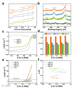 图 4. (a)在N2氛围下,0.5 mM的1-3在丙烯碳酸酯中的循环伏安图。(b)CNTs负载化合物1-3的钴2p XPS。(c)在O2饱和的0.1 M KOH溶液中,以1600 rpm转速旋转的1-3的旋转环盘电极LSV。(d)通过RRDE确定的1-3的ORR电子转移数。(e)在1.0 M KOH溶液中,以50 mV/s扫描速率进行的1-3的OER循环伏安图。(f)1-3的Tafel斜率图。