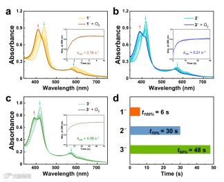 图 3. 通过UV-vis监测1–(a)、2–(b)和 3–(c)与O2反应的动力学研究。插图:对应于CoIII-超氧自由基的吸收时间。(d)1–、2–和3–与O2反应分别达到100%、70%和50%转化所需的时间。