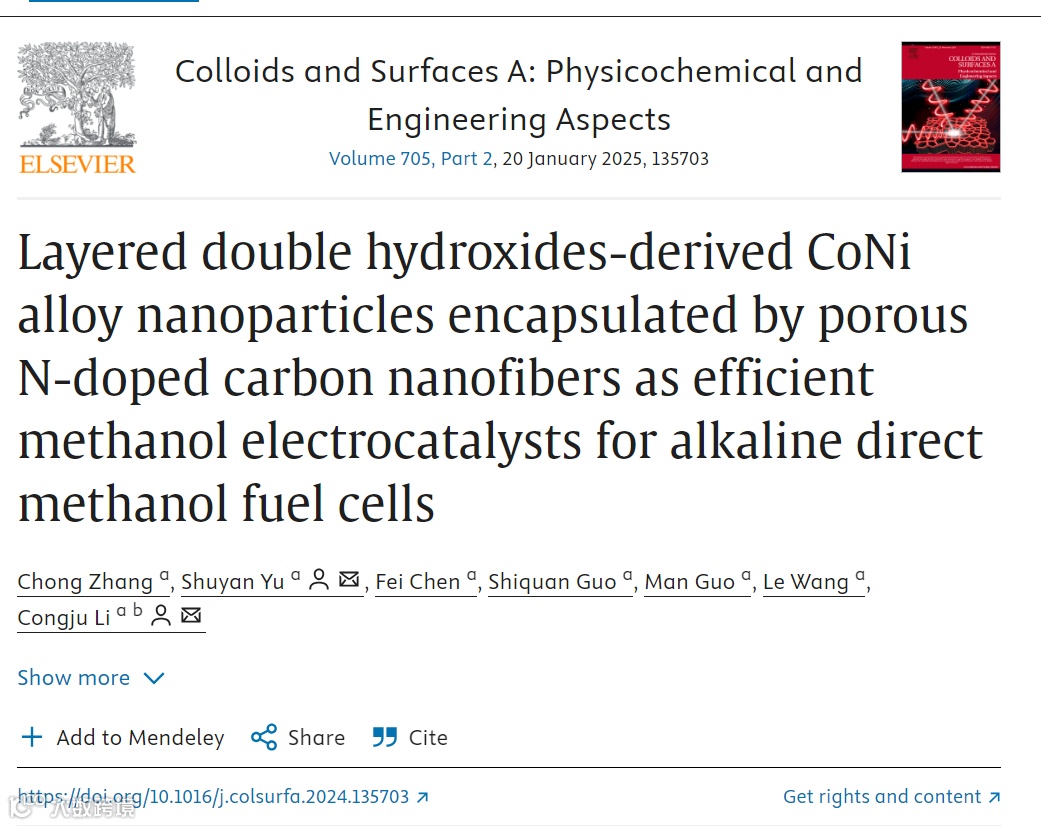近日,北京科技大学博士生张冲在期刊《Colloids and Surfaces A: Physicochemical and Engineering Aspects》上,发表了最新研究成果“Layered double hydroxides-derived CoNi alloy nanoparticles encapsulated by porous N-doped carbon nanofibers as efficient methanol electrocatalysts for alkaline direct methanol fuel cells”。研究者通过静电纺丝和高温热解的方法制备了层状双氢氧化物(LDH)衍生的钴镍合金纳米颗粒封装在多孔氮掺杂碳纳米纤维(CoNi@NCNFs)中,用作碱性直接甲醇燃料电池(ADMFC)的甲醇电氧化反应(MOR)的高效电催化剂。