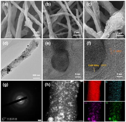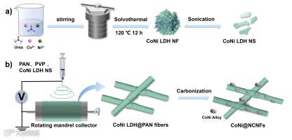 通过混合纺丝和高温热解过程制备CoNi@NCNFs电催化剂(如图1所示)。简言之,将钴镍双金属氢氧化物(CoNi-LDH)与聚丙烯腈等混纺,得到基于CoNi-LDH前驱体的聚丙烯腈纳米纤维(CoNi-LDH@PAN),进一步经过高温退火处理得到负载CoNi双金属合金纳米颗粒的碳纳米纤维电催化剂(CoNi@NCNFs)。在高温热处理过程中,CoNi-LDH不仅作为金属来源,也作为“自模版”受热分解,辅助成孔,同时纳米纤维可以抑制金属纳米颗粒的聚集。