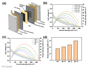 在三电极体系下测试所制备的CoNi@NCNFs催化剂的甲醇氧化活性,可以看出,优化后的CoNi@NCNF3-900催化剂具有较高的电催化活性,在0.7 V的面积比活性为80.3 mA cm-2。基于CoNi合金的协同效应,CoNi@NCNFs催化剂在长期测试过程中可以保持良好的稳定性。使用CoNi@NCNF3-900催化剂作为DMFC阳极,评估其单电池性能。通过优化甲醇供给流速以及工作温度,单电池最高输出功率密度为29.5 mW cm-2。在较高的温度下,单电池的输出功率密度随之提高,主要因为较高的温度有利于甲醇分子的扩散,同时增强了MOR的反应动力学。