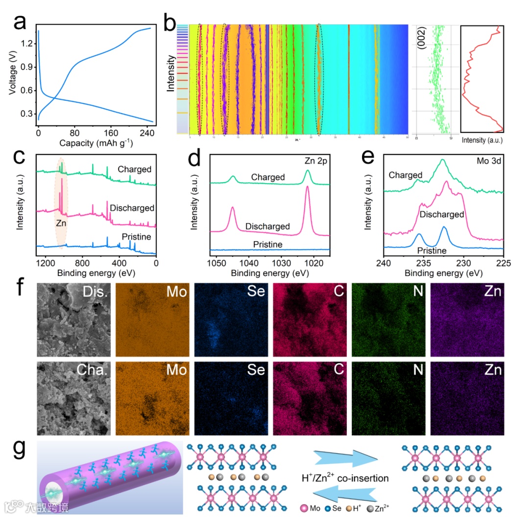 结合原位X射线衍射和离位X射线光电子能谱与微观结构的观察,揭示出了MoSe2空心纳米管结构中质子和锌离子的共储存机制。在电池的充放电循环中,质子和锌离子能够可逆地在MoSe2纳米管内进行扩散。此外,理论计算与系统的反应动力学研究进一步阐明了,采用纳米结构分子工程策略对电极反应动力学具有显著的积极影响。