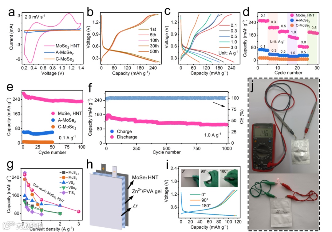 近日,来自华中科技大学的高义华教授,在国际知名期刊Chemical Engineering Journal上发表题为“Activated proton storage in molybdenum selenide via nanostructure molecular engineering”的研究文章。文章通过采用纳米结构分子工程策略研制出一种MoSe2空心纳米管材料,并成功地将这一材料应用于水系锌离子电池中,展现出了优良的性能。
