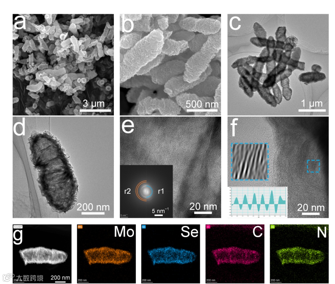通过巧妙地引入链状的辛胺分子,作者成功研发出了MoSe2空心纳米管。在反应过程中,辛胺分子扮演了多重角色,既是溶剂也是还原剂,同时还作为生长模板和活性剂,精准调控MoSe2的组成相和微观结构。在反应进行中,链状辛胺分子巧妙地嵌入MoSe2的中间层,既起到了润滑作用,有效延长了层间距,又发挥了支撑作用,显著增强了结构的稳定性。最终,辛胺分子与MoSe2分子之间牢固偶联在一起,构建出了一种有机-无机杂化的中空纳米管结构。