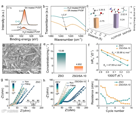 图5. (a) PVDF膜在纯H2O和SA/H2O溶液中浸泡3天后的XPS光谱,(b) ATR-FTIR光谱。(c) (CH2 = CF2) 单体与H2O分子、(CH2 = CF2) 单体与SA分子的结合构型优化和结合能计算。(d) MnO2基阴极在ZSO/SA-10电解液中50℃ 浸泡3天后的FESEM图像。(e) ZSO和ZSO/SA-10电解质中溶解Mn含量的ICP测试。(f) 用Arrhenius方程计算的ZSO和ZSO/SA-10电解质中MnO2阴极的活化能。Zn-MnO2电池在 (g) ZSO和 (h) ZSO/SA-10电解质下的原位EIS曲线,以及 (i) 对应的Rct拟合结果。