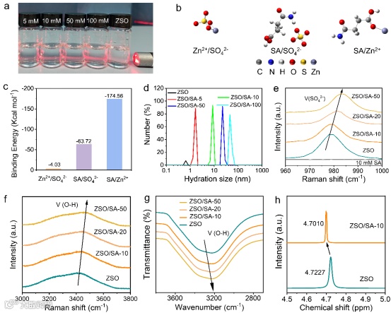图1. (a) 添加不同浓度SA添加剂的ZSO电解质激发的丁达尔效应的数码照片。(b)Zn2+、SO42−和SA之间的各种结合模型,(c) 对应的结合能。(d) 采用纳米激光粒度分析仪测试不同浓度SA添加剂下电解质胶体粒度的分布。添加不同浓度SA的ZSO电解质中 (e) SO42−和 (f) O─H键拉伸振动的拉曼光谱。(g) 添加不同浓度SA的ZSO电解质中O─H键拉伸振动的FTIR光谱。(h) ZSO和ZSO/SA-10电解质的2H NMR谱。