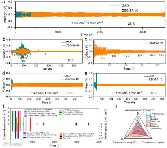 图4. 通过组装Zn/Zn对称电池来评估ZSO和ZSO/SA-10电解质中Zn沉积/剥离的可逆性。(a) 在1mAcm−2、1mAh cm−2、25℃条件下的循环性能测试。(b) 25℃下倍率性能测试。(c) 不同温度下的循环性能。循环性能测试分别在 (d) 1 mA cm−2、1 mAh cm−2、−10 ℃ 和 (e) 1 mA cm−2、1 mAh cm−2、50℃条件下进行。(f) 本工作与以往其他报告的循环寿命比较。(g)电解液的电化学性质与其他文献的比较。
