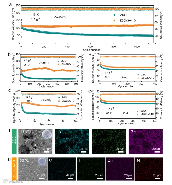 图6. ZSO和ZSO/SA-10电解质下全电池的电化学性能测试。对于Zn-MnO2电池: 分别在 (a) 1A g−1和- 10°C、(b) 1 A g−1和25°C以及 (c) 3 A g−1和50°C条件下进行循环性能测试。对于Zn-I2电池: Zn-I2电池在 (d) 1 A g−1和 25℃ 以及 (e) 1 A g−1和 60℃ 条件下的循环性能测试。(f) ZSO和 (g) ZSO/SA -10电解质在1A g−1和60°C下循环20次后的锌阳极表面的FESEM图像和相应的EDS能谱。