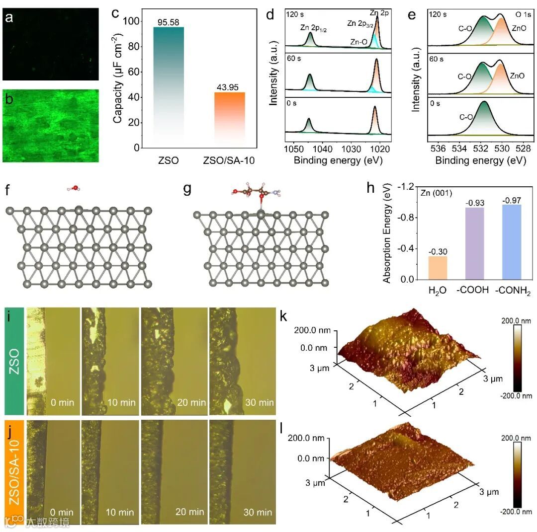 图2. 倒置荧光显微镜对ZSO中的Zn阳极进行描绘: (a) 10 mM SA, (b) 10 mM FITC共轭SA荧光图像。(c) ZSO和ZSO/SA-10电解质中Zn电极表面的双电层电容。(d) ZSO/SA-10电解液浸泡1 天后Zn阳极表面的Zn 2p和 (e) O 1s XPS光谱。(f) H2O和 (g) SA分子在Zn表面的吸附模型。(h) H2O和SA分子在Zn(001)平面上的吸附能。在10 mA cm−2电流密度下,Zn在 (i) ZSO和 (j) ZSO/SA-10电解质中沉积的原位光学观察。在 (k) ZSO和 (l) ZSO/SA-10电解液中,1 mA cm−2电流密度下循环20次后锌箔的AFM图像。