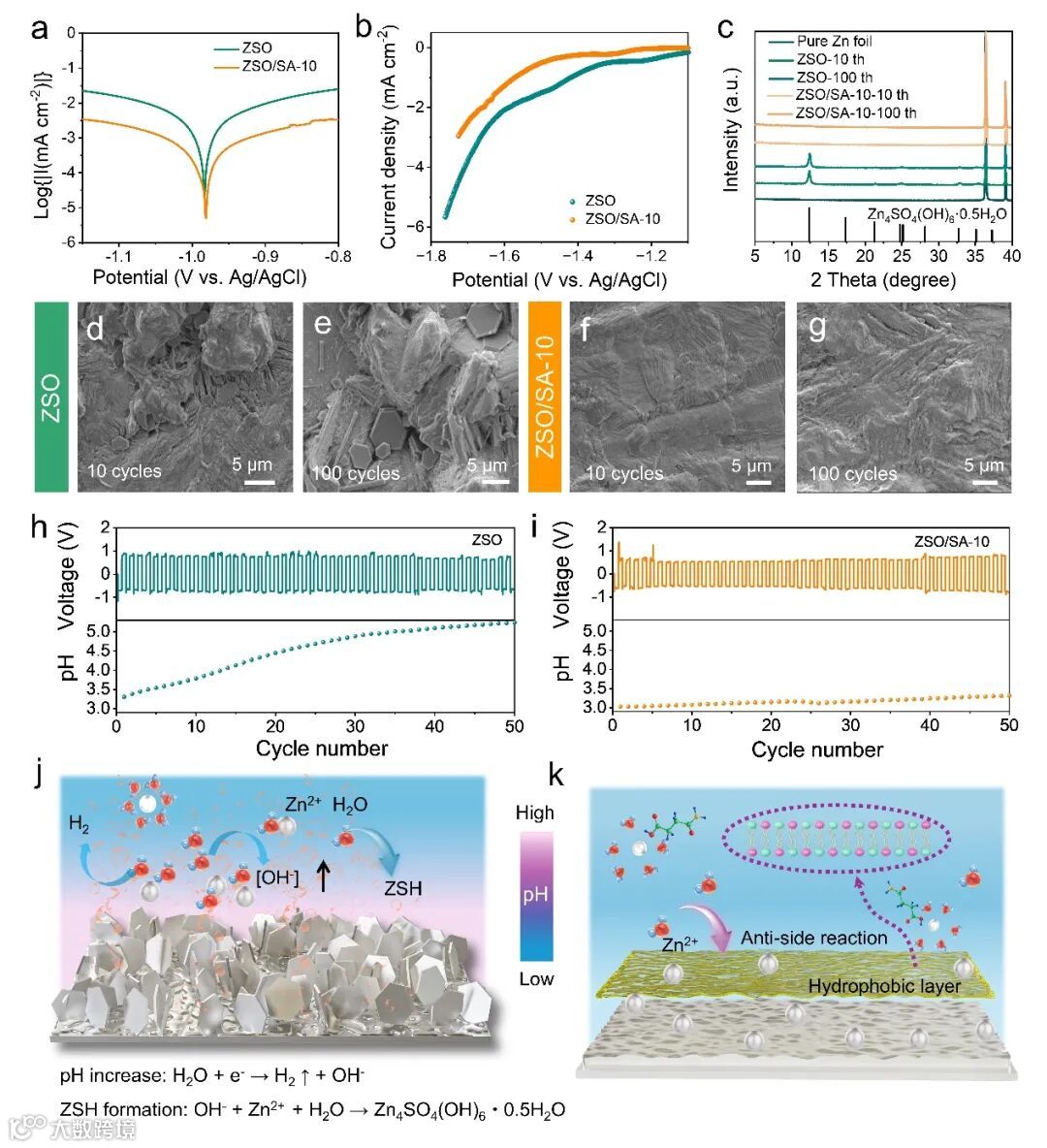 图3. (a) ZSO和ZSO/SA-10电解质中Zn电极的Tafel曲线。(b) 1 M Na2SO4和1 M Na2SO4 + 10 mM SA下Zn阳极的HER曲线。(c) ZSO和ZSO/SA-10电解质在1 mAcm−2和1 mAh cm−2下不同循环圈数后的Zn电极的XRD图谱和相应的 (d-g) FESEM图像。在 (h) ZSO和 (i) ZSO/SA-10电解质下,在20 mA cm - 2和5 mAh cm - 2条件下Zn/Zn对称电池的原位pH测试。经SA修饰的电解液 (j) 以及ZSO电解液 (k) 中锌负极 -电解质界面pH稳定机理示意图。