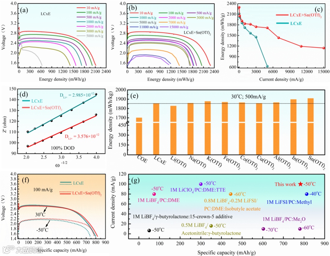CFx电极材料在含有Sn(OTf)2的电解质中展现出优异的倍率性能和低温性能。在30 oC和15000 mA/g的电流密度下,放电的能量密度为1145 Wh/kg。在-50 oC的极端低温和100 mA/g的电流密度下,CFx电极材料的放电比容量为783 mAh/g,容量保持率达到95.8%。