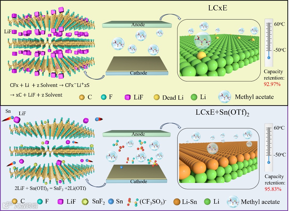 图1. Sn(OTf)2调控Li/CFx电池正负极界面的作用机制。