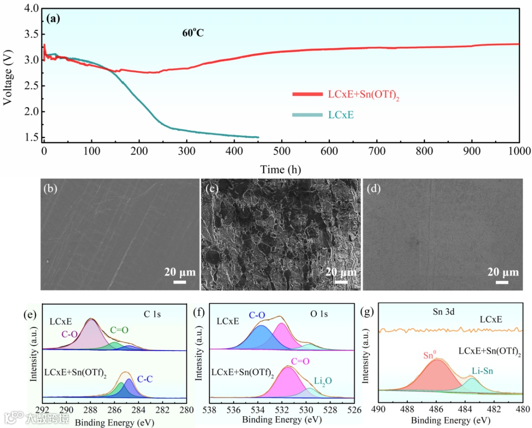 Sn(OTf)2中的Sn2+促进负极表面形成Li-Sn合金,有效抑制了电解液对锂金属表面的腐蚀,改善了Li/CFx电池的高温存储性能,在60 oC下存储时间超过1000 h。