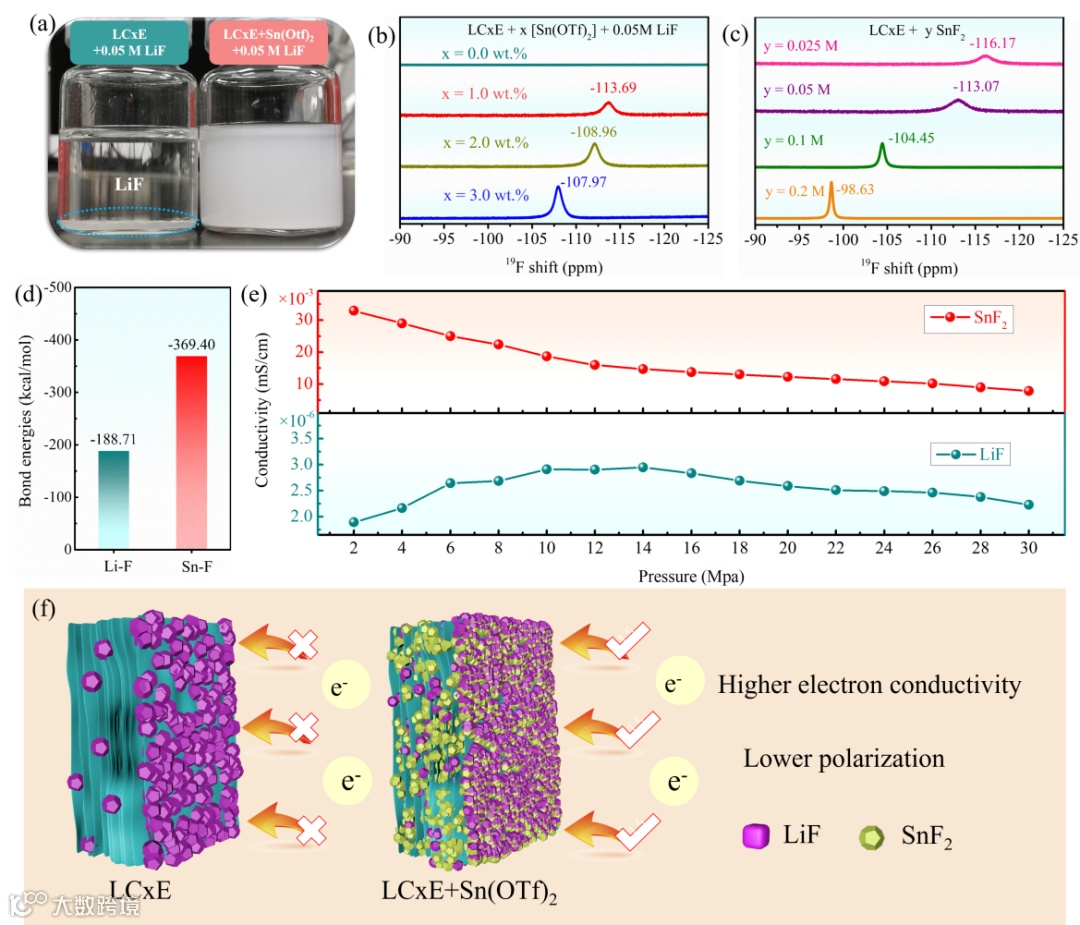 图2. Sn(OTf)2与LiF的反应产物及其对应的电子电导率。