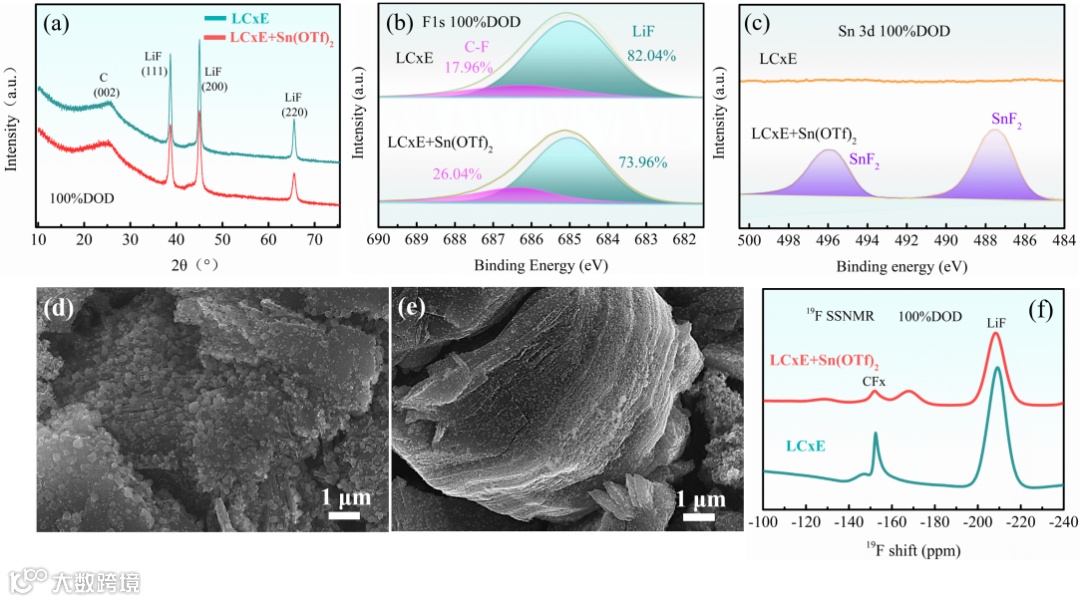 X射线衍射谱图和X射线光电子能谱表明在含有Sn(OTf)2的电解质中,完全放电态下的CFx电极表面产生的LiF含量明显下降,进一步转化为SnF2。19F固体核磁谱定量分析表明,CFx电极在含有Sn(OTf)2的电解质中完全放电后仅产生了0.35 mg的LiF,而在不含Sn(OTf)2的电解质中产生的LiF量为0.57 mg。高导电的SnF2的生成提高了CFx电极表面的导电性,促进了材料的进一步反应。