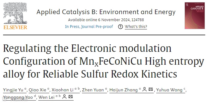 Applied Catalysis B: Environment and Energy上发表题为“Regulating the Electronic modulation Configuration of MnxFeCoNiCu High entropy alloy for Reliable Sulfur Redox Kinetics”2024.124788
