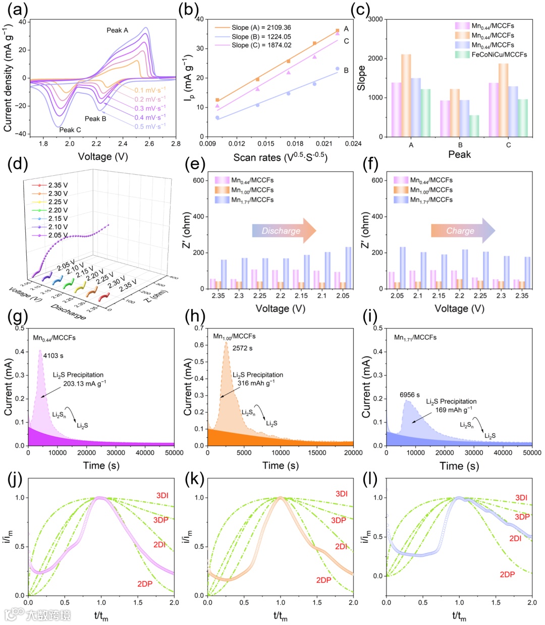 为了寻求Mn1.00/MCCFs优异性能的来源,实验评估了Mn1.00/MCCFs的锂离子扩散速率、电化学阻抗及Li2S成核等动力学能力。结果表明,Mn1.00/MCCFs具有较快的锂离子扩散速率有助于离子快速传输,in-situ EIS表明Mn1.00/MCCFs在不同电位下均具有最小的电化学阻抗有利于电子转移。恒电位Li2S成核结果显示合适的活性位点有效平衡电解质中表面原子的横向扩散和传质,从而实现快速成核。