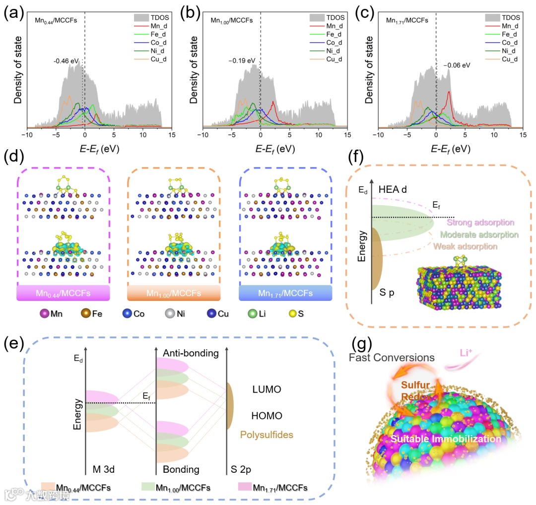 为了深入研究Mn的改变对MnFeCoNiCu催化性能的影响,DFT计算结果表明,Mn1.00/MCCFs具有最为合适的d带中心,符合Sabatier原理。此外,以Mn为主要电子消耗中心,Fe、Ni、Cu作为电子受体以及主要吸附位点和催化中心协同,这重新建立了表面电荷分布,从而提高了Mn1.00/MCCFs多电子反应的性能。