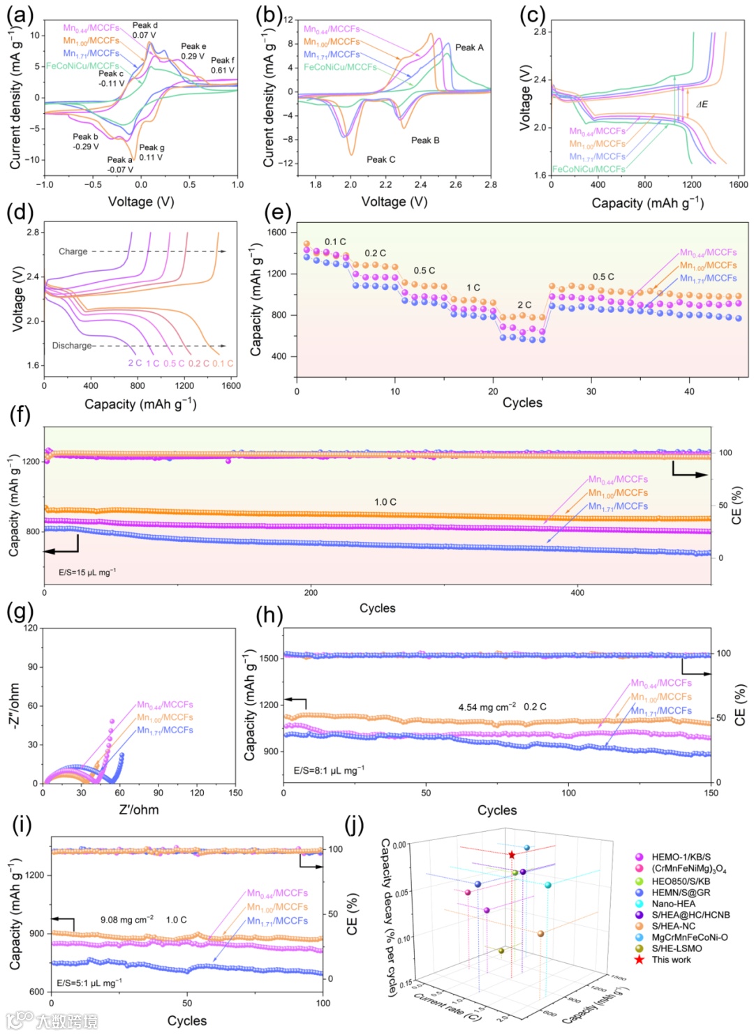 实验表明,所制备的Mn1.00/MCCFs/S电极再0.1 C下可以实现1497 mAh g−1的高比容量,此外,Mn1.00/MCCFs/S电极在1.0 C下可以提供938 mAh g−1的高初始放电容量,在500次循环后保持在876 mAh mAh g−1(每个循环的容量衰减率低至0.013%),表现出更好的循环稳定性,库仑效率在整个循环中保持在98%以上。即使在高硫负荷为4.54 mg cm−2和9.08 mg cm−2的情况下,Mn1.00/MCCFs/S电极仍能提供十分优异的初始放电容量及循环稳定性,优异的循环耐久性可归因于Mn1.00/MCCFs/S在高硫负荷条件下卓越的LiPSs的导能力。此外,所制备的Mn1.00/MCCFs/S电极的倍率性能和循环性能均优于目前报道的大多数高熵材料电极。