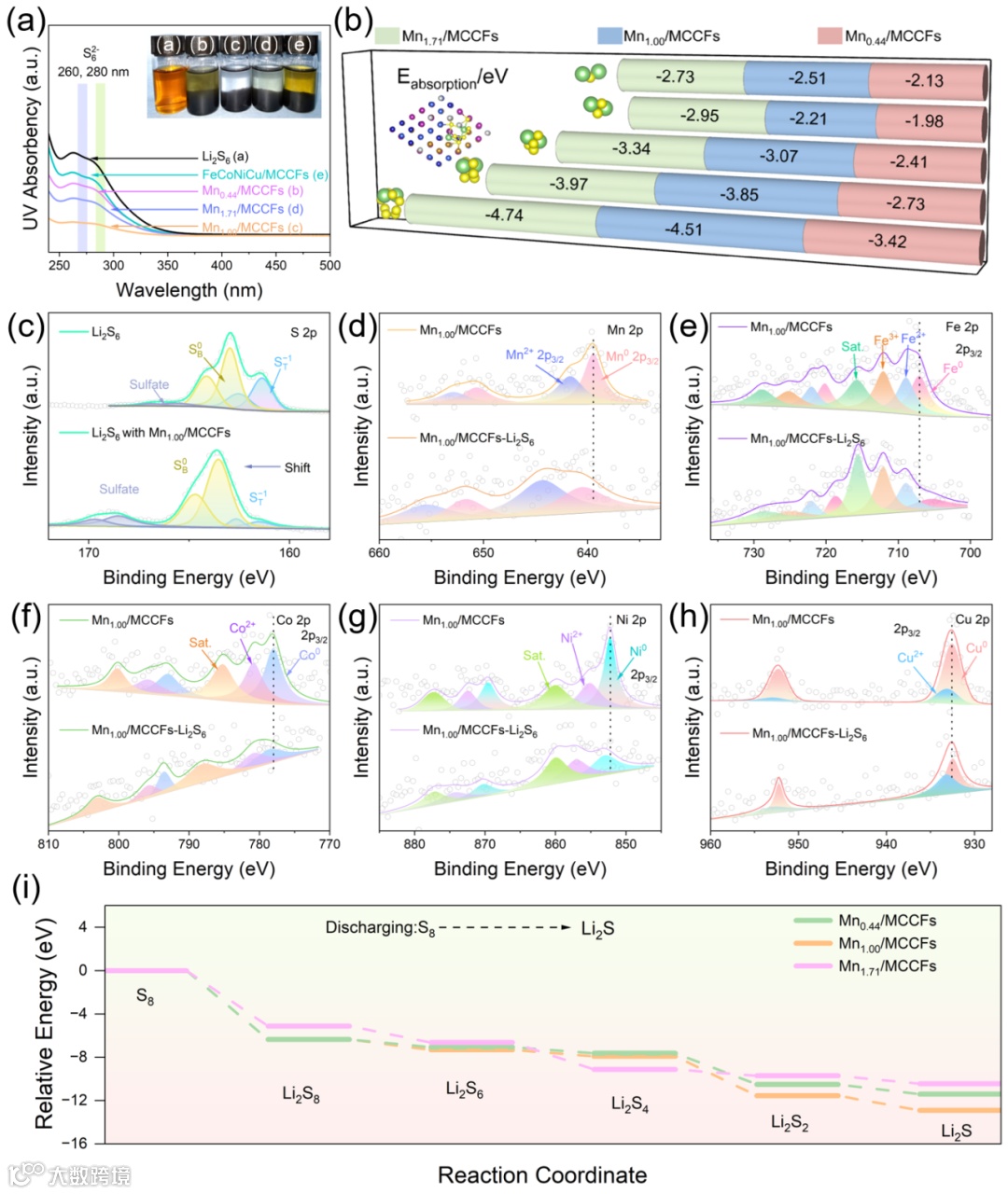 进一步研究了Mn含量对MnFeCoNiCu吸附多硫化物的影响。紫外-可见(UV-vis)吸附光谱显示出Mn1.00/MCCFs处理后的溶液吸收强度显著降低,表明Mn1.00/MCCFs与可溶性Li2S6的亲和力显著增强。DFT计算结果和XPS结果均显示出M-S相互作用结果,显著增强了Mn1.00/MCCFs样品抵抗高浓度LiPSs的能力。负自由能表明从S8和LiPSs到Li2S的初始分步反应在热力学上是有利的。这些结果表明,Mn1.00/MCCFs的催化活性和反应途径受催化剂表面电子结构的显著影响,有利于促进LiPSs的转化。