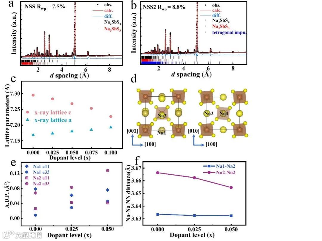 图1. 从上海同步辐射装置(SSRF)BL14B光束线获取的同步辐射粉末数据的Rietveld精修图:(a)NSS,(b)NSS2。(c)Na3-□Sb1-4x(SnWCaTi)xS4的晶格参数随掺杂水平的变化。(d)从c轴和a轴方向分别观察的四方晶体结构。(e)基于Rietveld分析的NSS、NSS1和NSS2各向异性位移参数的演变。(f)基于Rietveld分析的NSS、NSS1和NSS2中Na–Na最近邻距离。