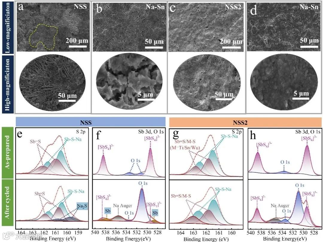 循环后NSS2/Na5Sn界面的SEM图像显示出均匀且平滑的形态。其光学照片、背散射电子(BSE)图像和EDS显示,循环后的NSS2电解质中界面副产物量较少,没有明显的富钠区域。此外,Na5Sn合金呈现出致密的切片,没有明显的裂纹和空隙。表明独特的构型熵结构提高了电解质的热力学稳定性,并抑制了“死”钠的形成。XPS分析表明NSS2与Na5Sn合金具有更好的界面相容性,有效地防止了循环过程中的还原反应。同时,NSS2的内在稳定性有效地防止了电解质的分解,抑制混合离子-电子导体的形成和持续的界面降解。