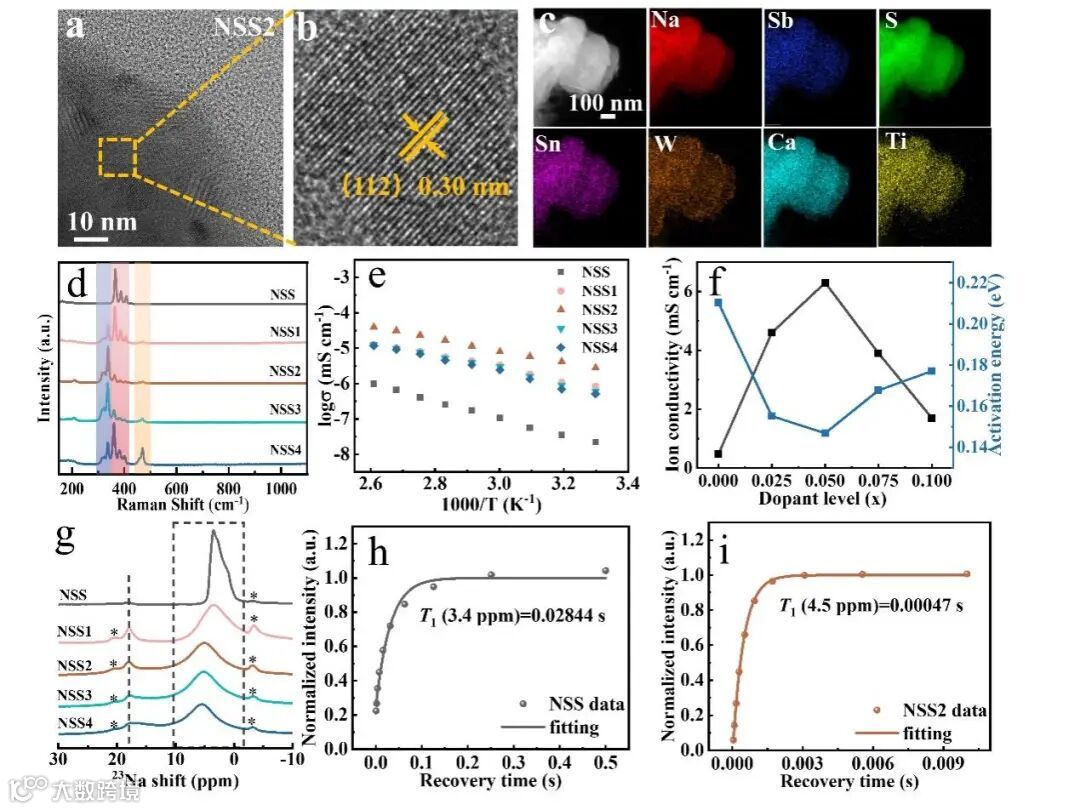 图2. (a)NSS2的透射电子显微镜(TEM)图像,(b)高分辨透射电子显微镜(HRTEM)图像,(c)能量色散X射线光谱(EDS)元素分布图。(d)Na3-□Sb1-4x(SnWCaTi)xS4的拉曼光谱。(e)Na3-□Sb1-4x(SnWCaTi)xS4的阿伦尼乌斯(Arrhenius)图。(f)室温离子电导率和活化能随Na3-□Sb1-4x(SnWCaTi)xS4掺杂水平的变化。(g)²³Na固态核磁共振(ssNMR)光谱。(h)NSS和(i)NSS2的²³Na T₁弛豫时间对比图。