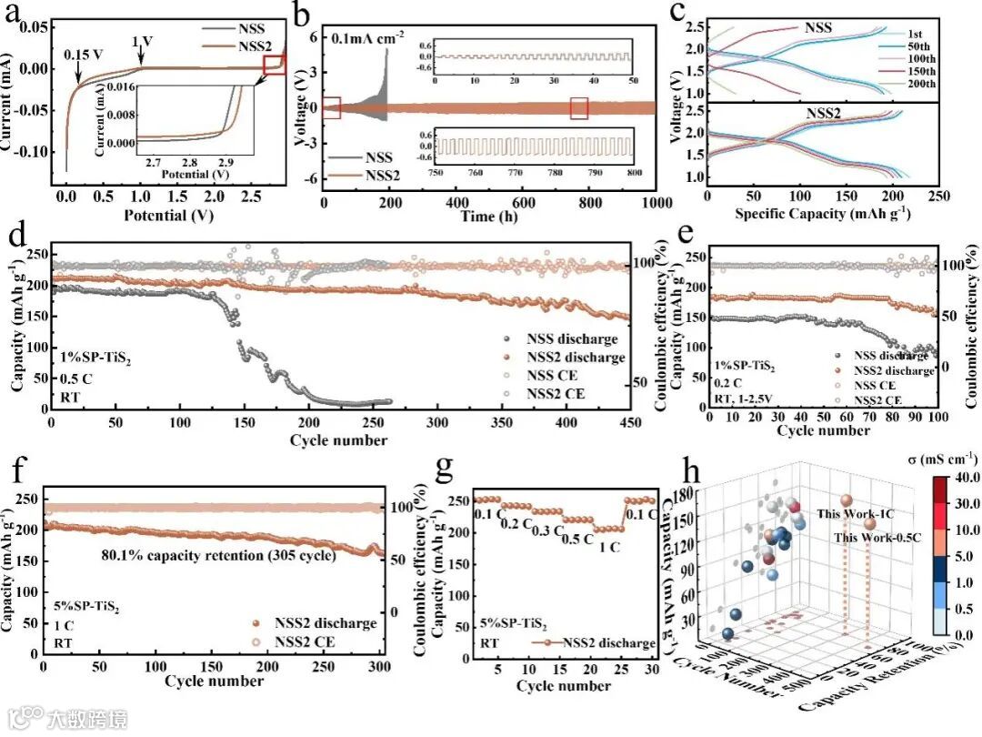 图3. (a)不锈钢//Na电池的线性扫描伏安曲线(LSV)。(b)Na–Na对称电池在电流密度为0.1 mA cm⁻²下的恒流循环曲线。(c)1%SP-TiS₂//Na₅Sn全固态钠电池(ASSSBs)在不同循环中的充放电曲线。(d)质量负载为1.25 mg cm⁻²、0.5C下1%SP-TiS₂//Na₅Sn ASSSBs的循环性能。(e)质量负载为3.12 mg cm⁻²、0.2C下1%SP-TiS₂//Na₅Sn ASSSBs的循环性能。(f)质量负载为1.25 mg cm⁻²、1C下5%SP-TiS₂/NSS₂/Na₅Sn电池的长循环稳定性和(g)倍率性能。(h)已报道电解质的离子电导率总结图以及TiS₂作为活性材料的全固态钠电池的对应性能。