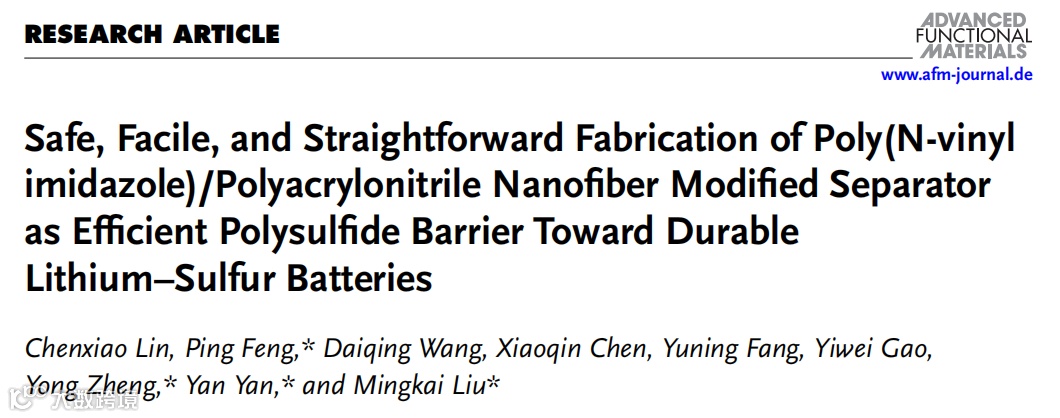 Lin C, Feng P, Wang D, et al. Safe, Facile, and Straightforward Fabrication of Poly(N-vinyl imidazole)/Polyacrylonitrile Nanofiber Modified Separator as Efficient Polysulfide Barrier Toward Durable Lithium–Sulfur Batteries[J]. Advanced Functional Materials, 2024: 2411872.