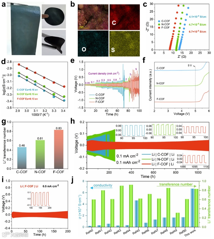 图4 固态电解质膜F-COF的实物图及相关的电化学性能测试。