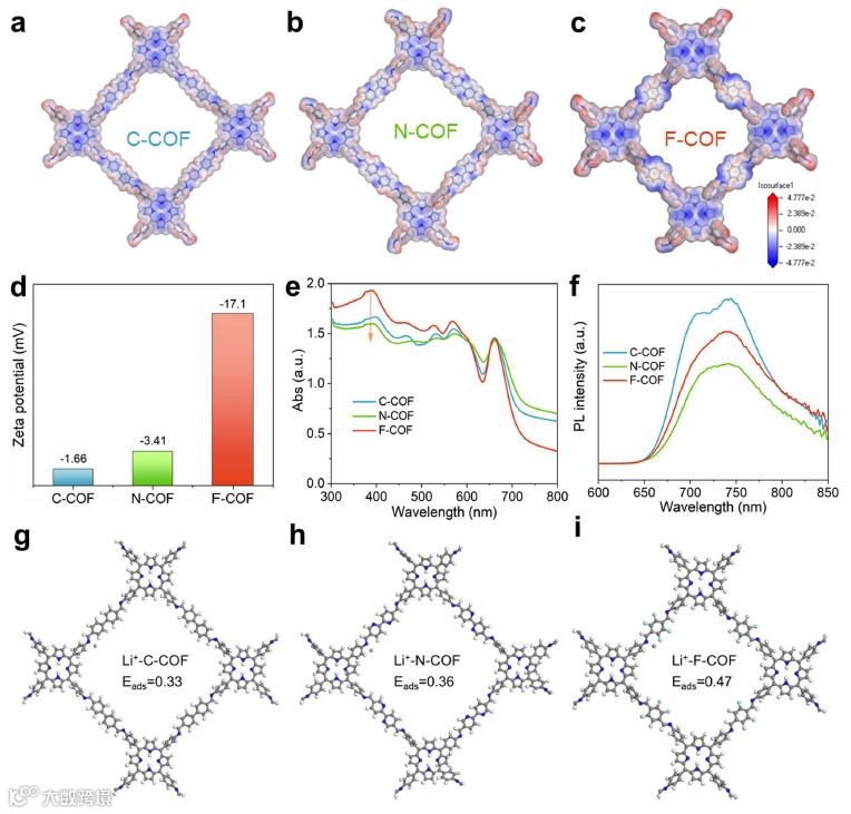 要点三:以理论计算的方式研究不同D-A连接的COF电解质的表面静电势,强电负性F原子修饰的电解质材料能够显著的调控电子密度和电荷分散;最负的Zeta值表明其电子密度最大,结合能计算也表明锂离子跟富电子的固态电解质F-COF作用力最大。