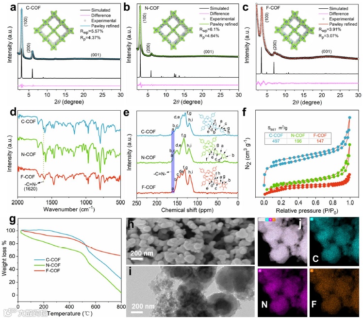 图2 不同D-A结构的COF固态电解质材料的表征。