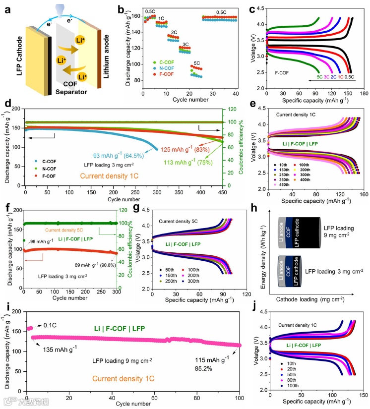 要点六:以不同D-A连接的固态电解质C-COF、N-COF和F-COF组装磷酸铁锂电池,其中富电子的F-COF固态电解质具有最好的倍率性能,1C下经过450次循环后保持率达到83%,明显高于另外两种材料。并且,能够在5C下仍然具有较好的稳定性,也能承受正极高载量的运行。所以,富电子的固态电解质明显改善电池的整体性能。