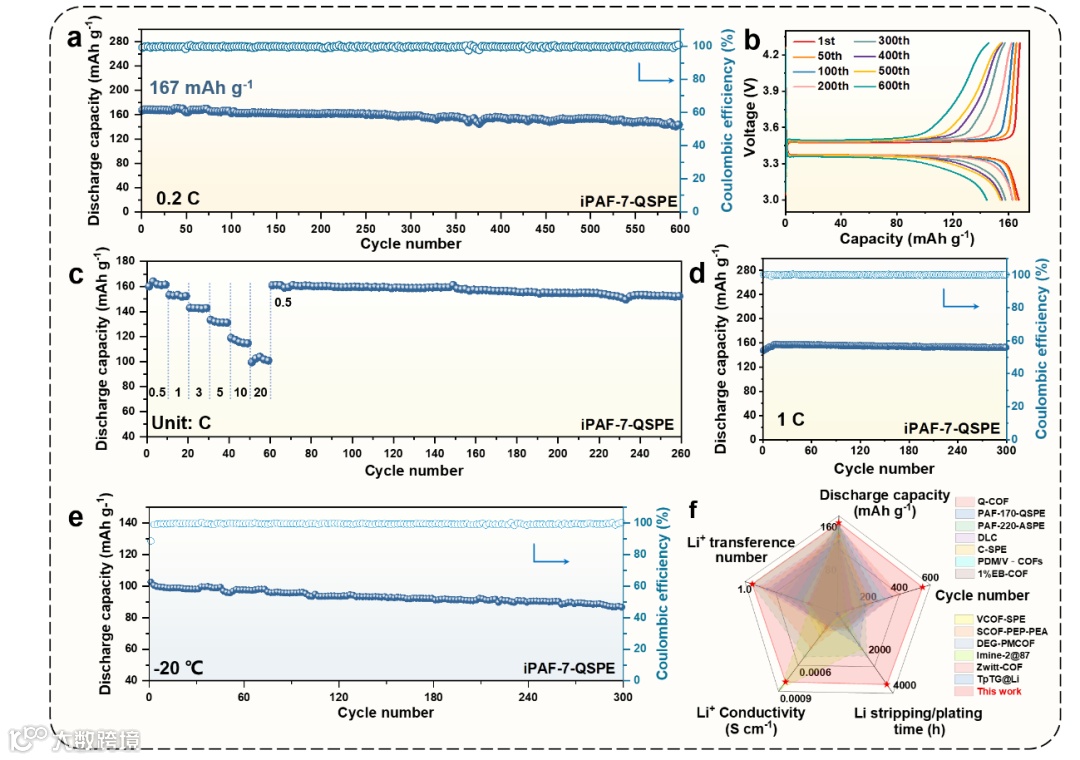 图5. Li//iPAF-7-QSPE//LFP电池的循环性能和库仑效率、倍率性能、-20 ℃下的循环性能和库仑效率及iPAF-7-QSPE与Li//Li电池和LFP//Li电池中其他已报道的聚合物电解质的性能比较。
