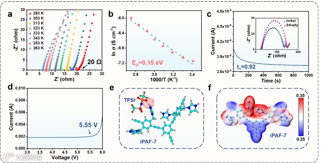 图3. iPAF-7-QSPE组装电池的电化学性能测试及密度泛函理论研究。