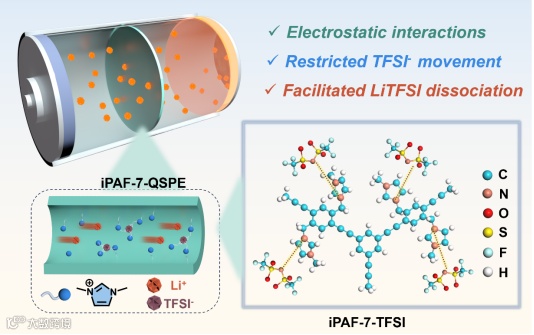 图1. 固态聚合物电解质的中,iPAF-7与LiTFSI的相互作用示意图。