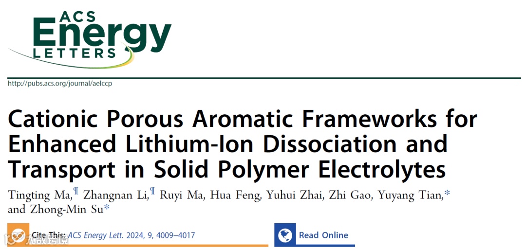 近日,来自长春理工大学的苏忠民教授与东北师范大学的田宇阳教授合作,在国际知名期刊ACS Energy Letters上发表题为“Cationic Porous Aromatic Frameworks for Enhanced Lithium Ion Dissociation and Transport in Solid Polymer Electrolytes”的文章。该文章研究了如何能够有效解离SPEs内锂盐中的强离子对,进而提高Li+电导率和Li+迁移数。基于iPAF-7的准固态聚合物电解质iPAF-7-QSPE在20 ℃时离子电导率为7.92×10-4 S cm-1, Li+转移数达到了0.92。同时,iPAF-7-QSPE具有稳定的镀锂/剥离行为,在4500 h后极化电压维持在6 mV。此外,Li//iPAF-7-QSPE//LFP在0.2 C下的初始放电比容量达到了167 mAh g-1,循环600次后容量保持率高达89%。这项研究为通过设计阴离子受体来调控固态聚合物电解质的电化学性能提供了有价值的见解,推动了固态聚合物电解质材料的设计与探索。