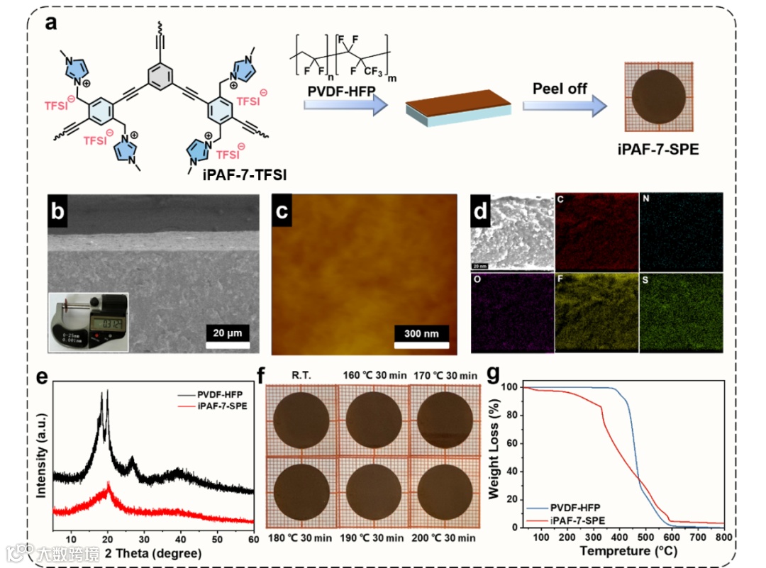 图2. iPAF-7-SPE的合成路线、形貌、结晶性、尺寸稳定性及热稳定性表征。