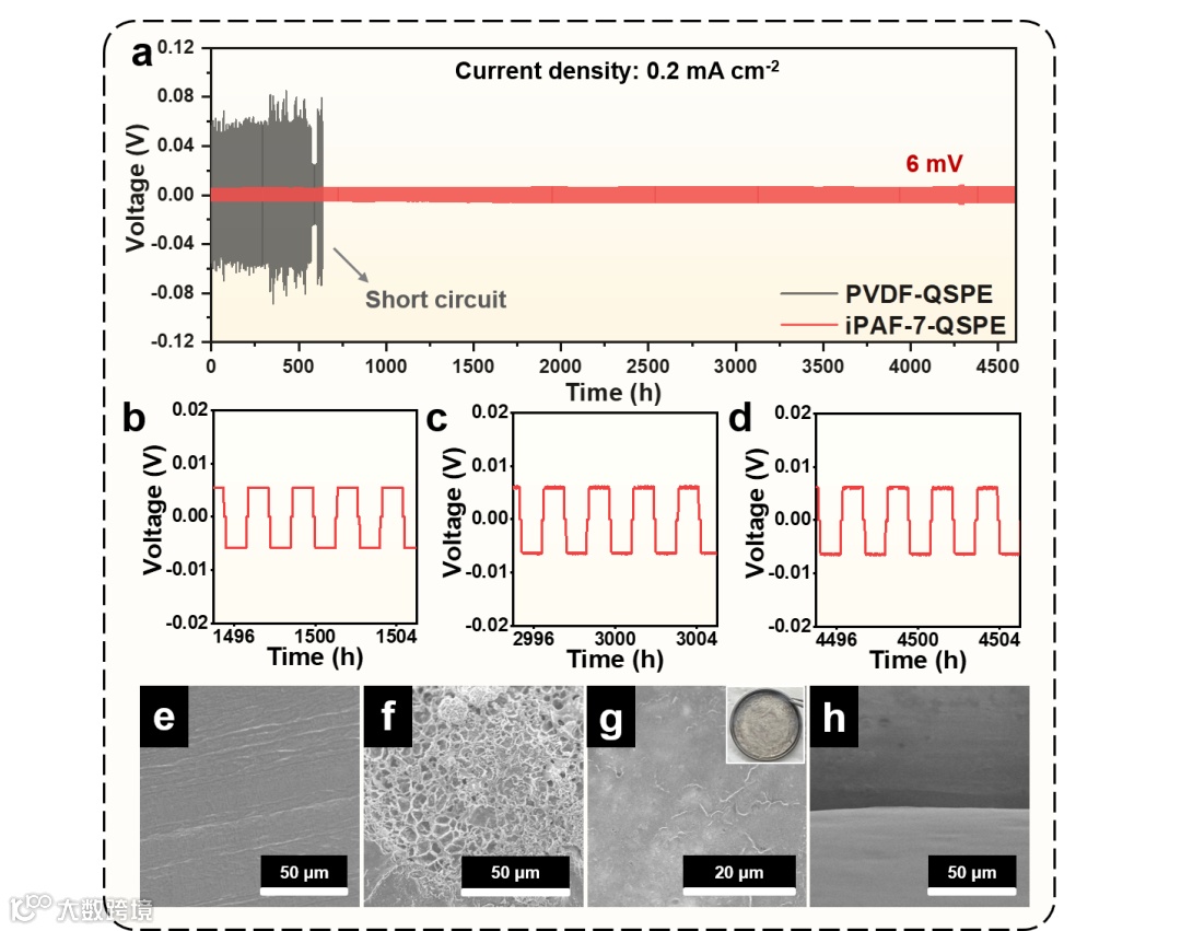 图4. 对称Li//iPAF-7-QSPE//Li电池在电流密度为0.2 mA cm-2时的恒流镀锂/剥离电压分布图、电镀/剥离后Li//PVDF-QSPE//Li及Li//iPAF-7-QSPE//Li中锂箔的形貌图。