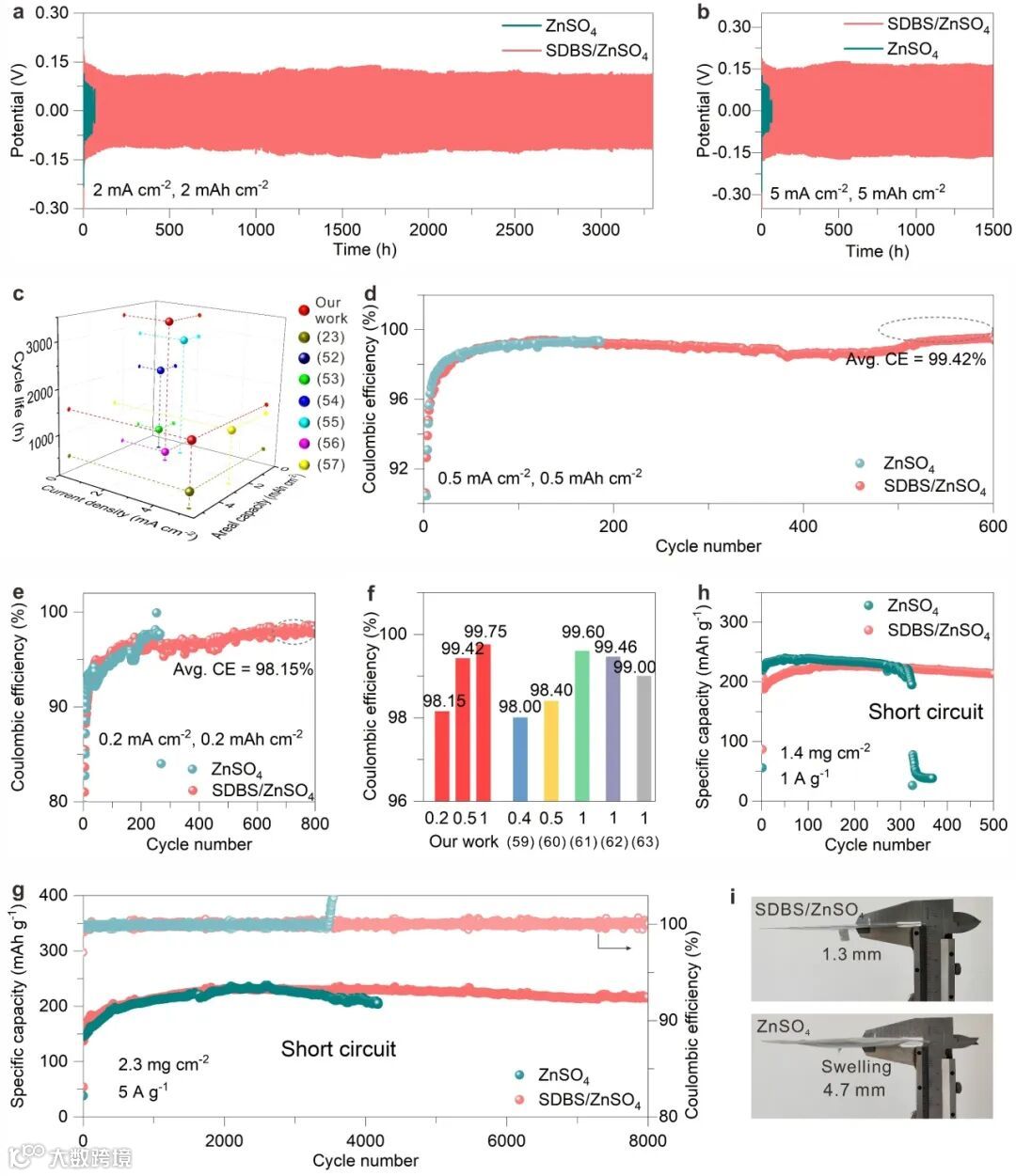 由于SDBS促进锌的均匀成核和扩散过程,锌沉积/剥离过程中的枝晶生长被极大地抑制了。SEM、三维共聚焦显微镜和原位显微观察可以看到在ZnSO4电解液中有明显的枝晶生长,而在SDBS/ZnSO4电解液中得到均匀致密的沉积形貌。