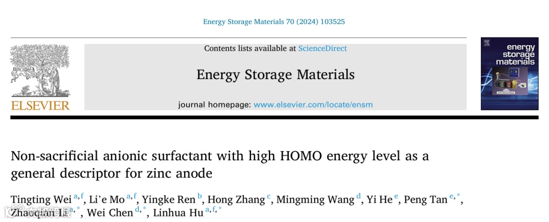 近日,来自中科院合肥物质研究院固体物理研究所的胡林华研究员、李兆乾副研究员与中国科学技术大学陈维教授和谈鹏教授合作,在国际知名期刊Energy Storage Materials上发表题为“Non-sacrificial anionic surfactant with high HOMO energy level as a general descriptor for zinc anode”的研究文章。该研究文章提出一种通过分子HOMO能级选择稳定锌负极用的非牺牲性阴离子型表面活性剂电解液添加剂的通用策略,通过具有高HOMO能级的十二烷基苯磺酸钠 (SDBS) 的调节作用,获得稳定可逆的锌金属负极,助力高性能的水系锌离子电池。