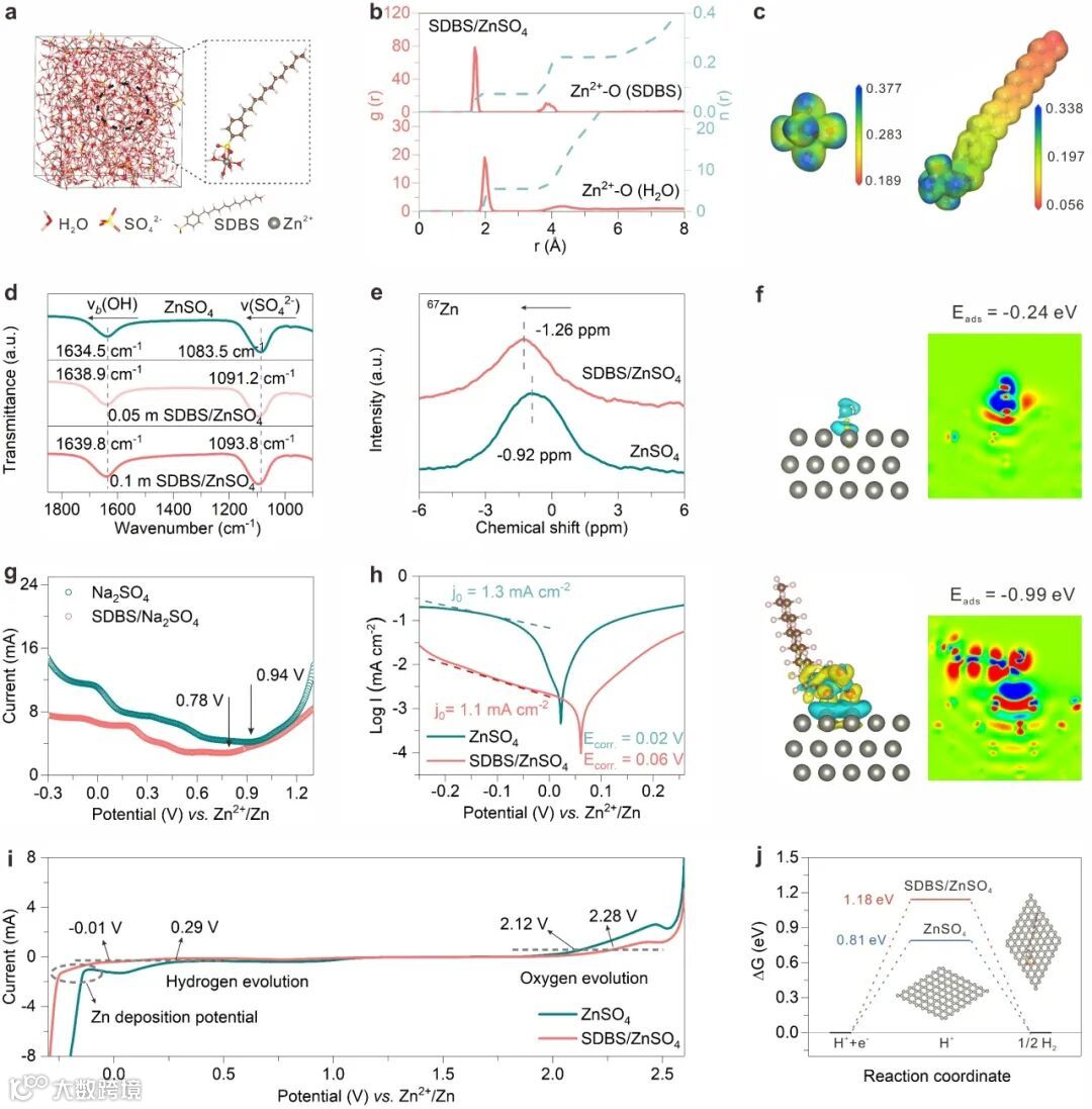图3. (a)SDBS/ZnSO4电解液中MD模拟快照。(b)SDBS/ZnSO4电解液中Zn2+-O (添加剂)、Zn2+-O (H2O) 的配位数和RDFs。(c)不同溶剂化结构 (Zn(H2O)62+和Zn(H2O)5SDBS+) 的静电势。(d)不同电解液的FTIR光谱。(e)ZnSO4和SDBS/ZnSO4电解液的67Zn NMR谱。(f)锌表面H2O和SDBS的吸附能和相应的差分电荷密度图。黄色和蓝色分别表示电子的积累和损失。(g)添加/不添加SDBS时Na2SO4溶液的差分电容曲线。(h)ZnSO4和SDBS/ZnSO4电解液的Tafel曲线。(i)ZnSO4和SDBS/ZnSO4电解液的LSV曲线。(j)ZnSO4和SDBS/ZnSO4电解液的析氢能垒。