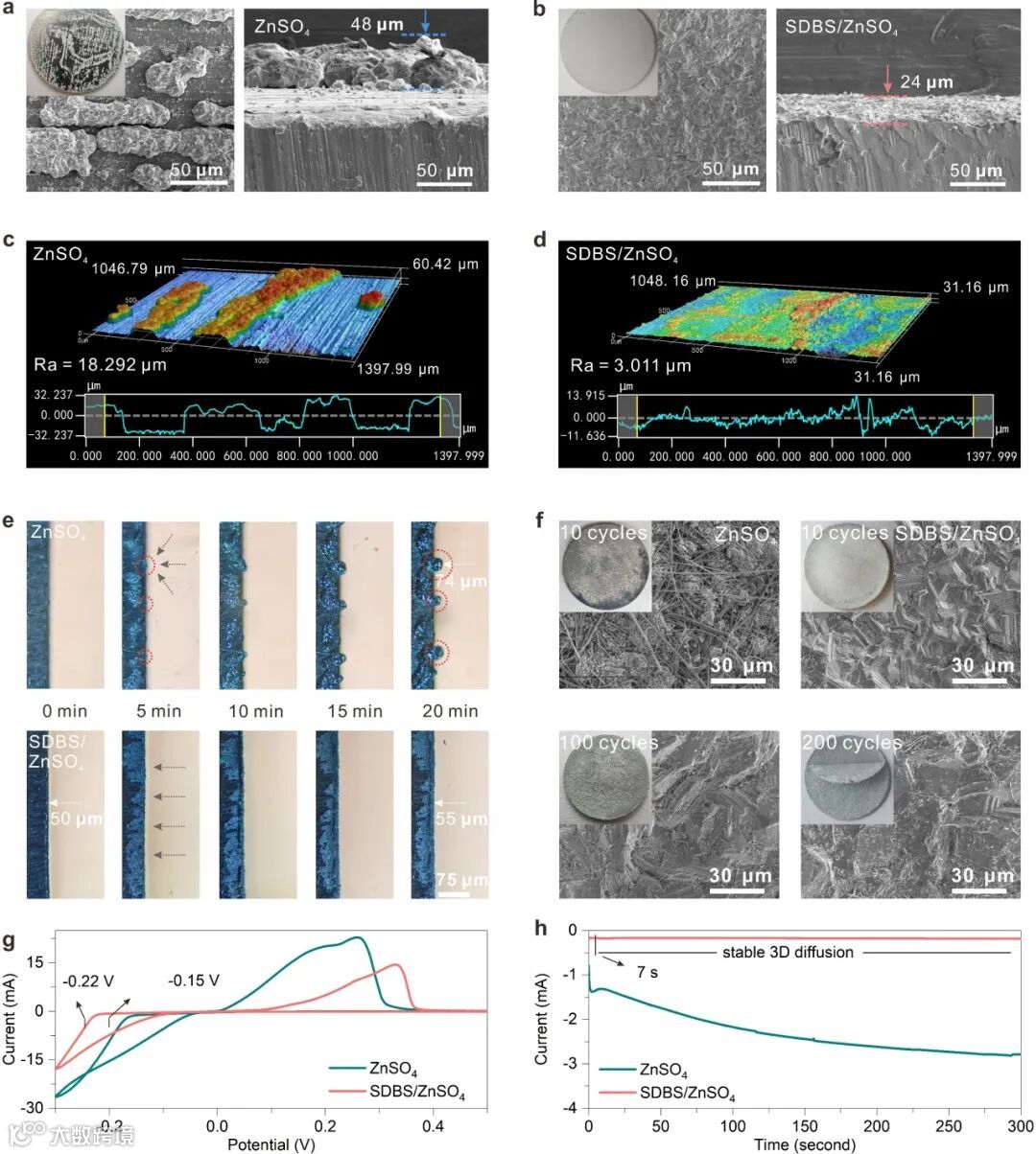 图4. 在(a)ZnSO4和(b)SDBS/ZnSO4电解液中10 mAh cm−2沉积1 h后锌片的表面和截面SEM图。(c, d)ZnSO4和SDBS/ZnSO4电解液中10 mAh cm−2沉积1 h后锌片表面的3D共聚焦显微图。(e)10 mA cm−2下ZnSO4和SDBS/ZnSO4电解液中沉积的原位光学显微观察图。(f)5 mA cm-2和5 mAh cm-2下循环不同圈数(10次、100次和200次)后循环Zn表面的SEM图像。ZnSO4和SDBS/ZnSO4电解液中的(g)成核过电势曲线和(h)恒电位时间-电流曲线。