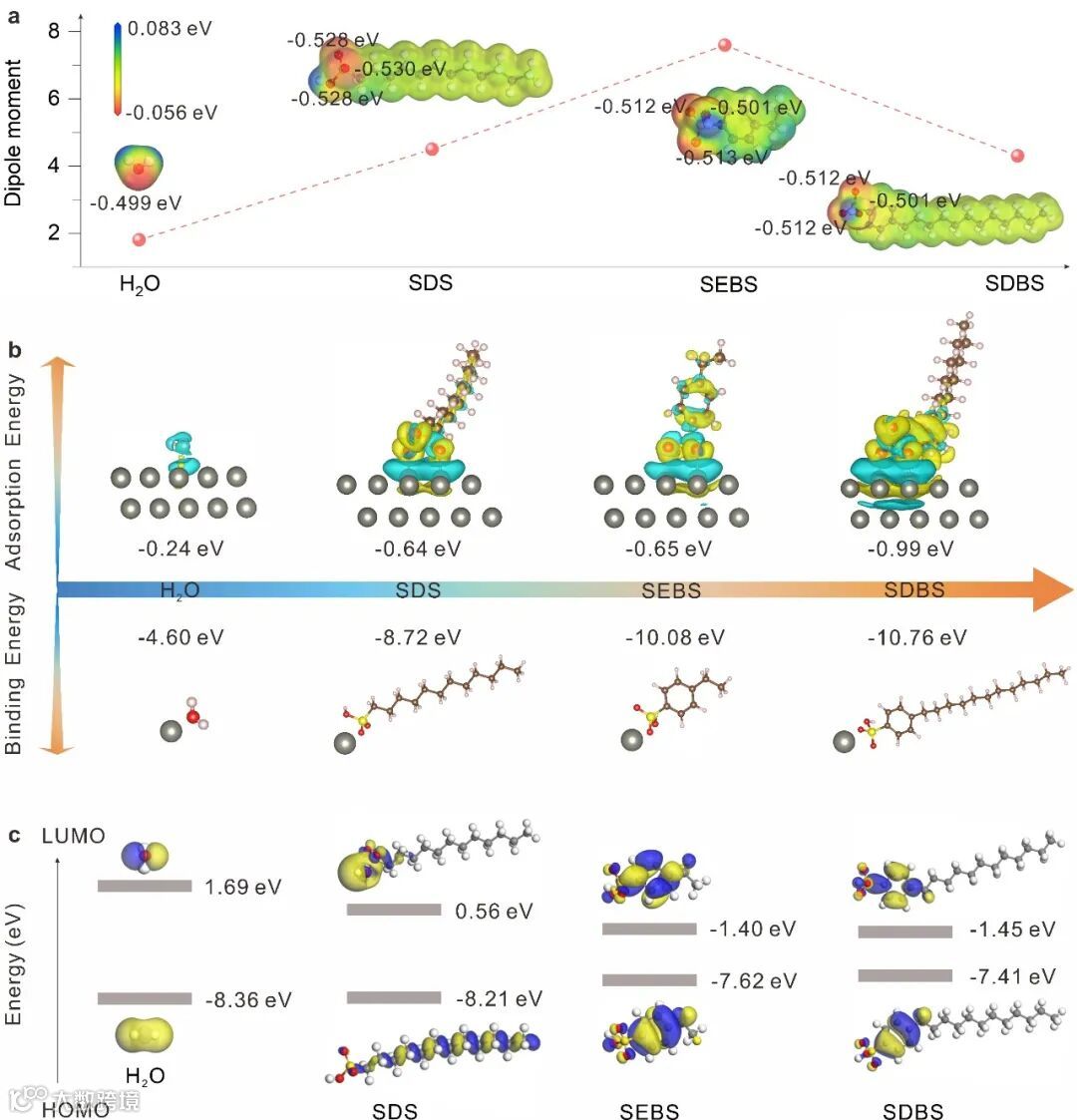 图2. (a)H2O、SEBS、SDS和SDBS分子中O原子电荷和分子DM值。(b)不同分子与Zn2+的结合能,以及不同分子在Zn表面的吸附能。(c)不同分子的LUMO和HOMO能级值。