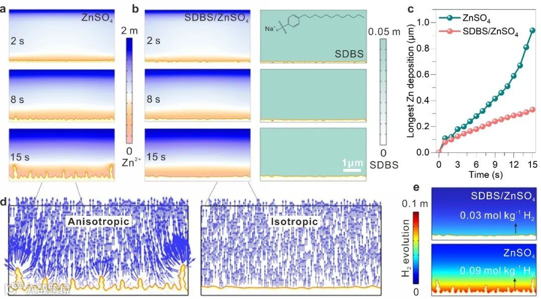 图5. 在ZnSO4和SDBS/ZnSO4电解液中的COMSOL模拟图。